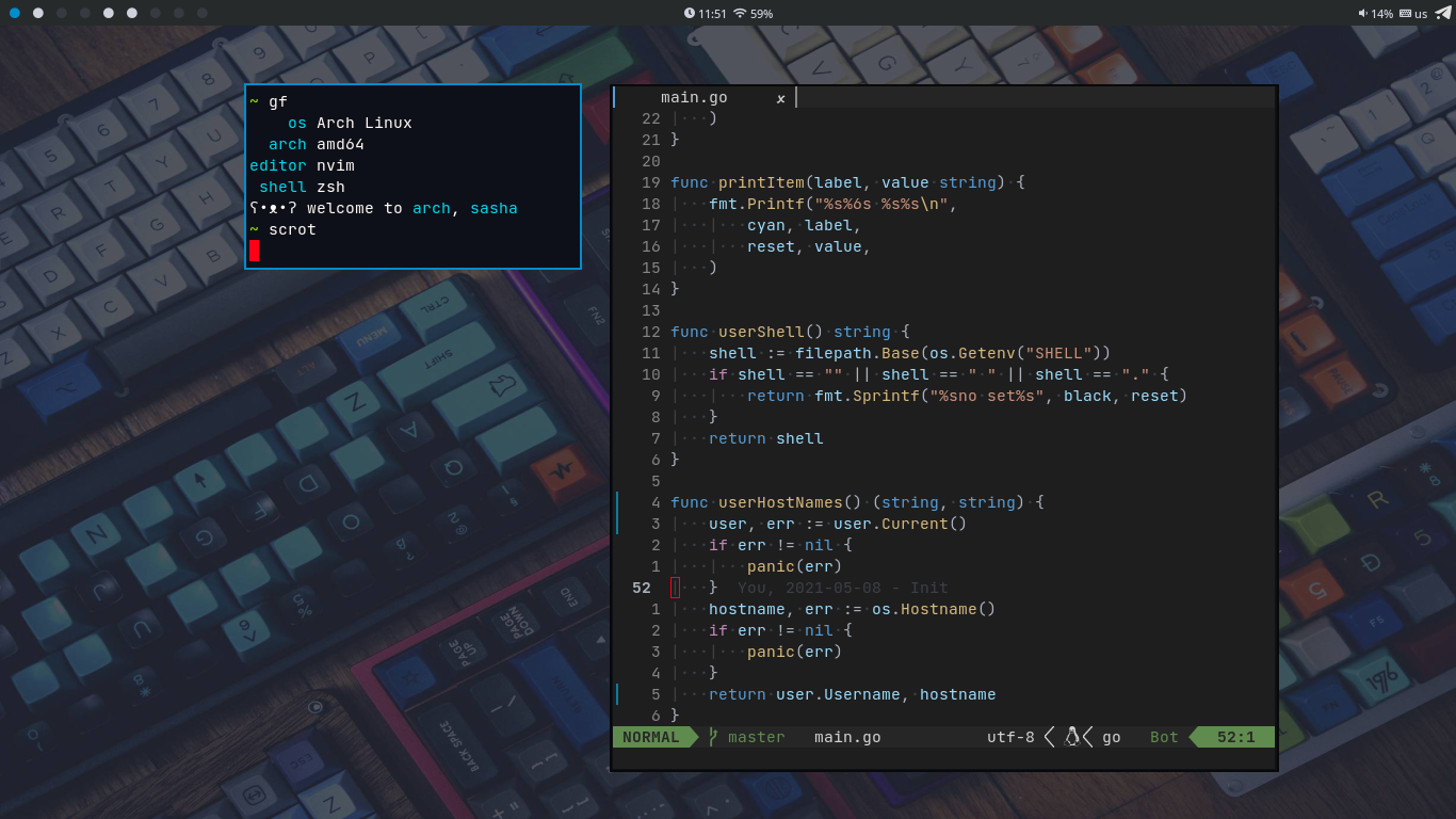 | bspwmrc | Update bspwm theme, lvim | 4 years ago 2021-09-20 16:50:53 EEST |